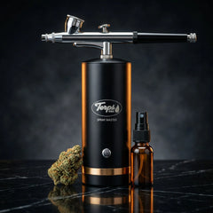 The Spray Master atomizer produces an ultra-fine, even mist that distributes terpenes across flower more consistently than a standard spray top. Compared to a bag method, the Spray Master can double your coverage — meaning you use less spray and get better, more even results every time.